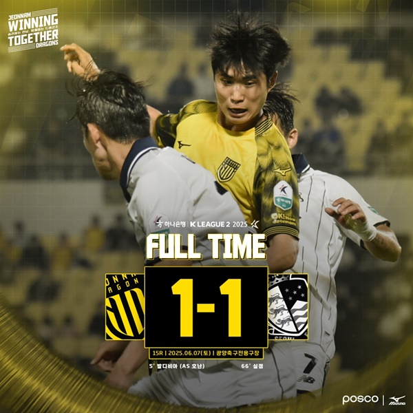 Àü³²Àº 7ÀÏ Åä¿äÀÏ ±¤¾çÃ౸Àü¿ë±¸Àå¿¡¼ ¿¸° ÇϳªÀºÇà K¸®±×2 2025 15¶ó¿îµå ¼¿ï ÀÌ·£µå¿ÍÀÇ È¨°æ±â¿¡¼ 1-1·Î ºñ±â¸ç Ȩ 4°æ±â ¹«ÆÐ¸¦ ±â·ÏÇß´Ù.