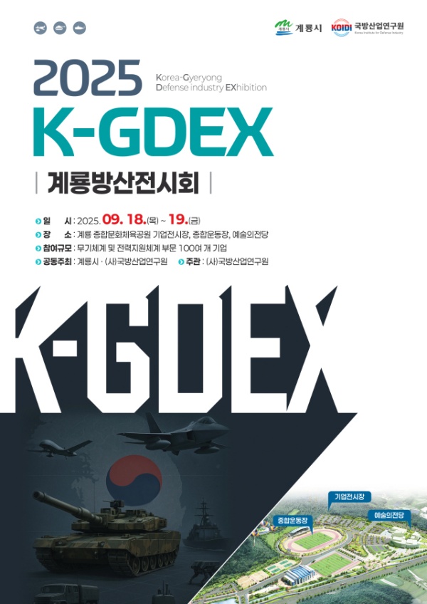 'K-GDEX 2025'´Â °è·æ½Ã¿Í (»ç)±¹¹æ»ê¾÷¿¬±¸¿øÀÌ °øµ¿ ÁÖÃÖÇϰí Ãæ³²µµ, ±¹¹æ±â¼úÁøÈ↓±¸¼Ò, °Ç¾ç´ëÇб³, »ïÀ°Àç´Ü µî ´Ù¾çÇÑ ±â°üÀÌ ÈÄ¿øÇÏ´Â Çà»ç´Ù. ³»´Þ 18ÀϺÎÅÍ 19ÀϱîÁö Ãæ³² °è·æ½Ã Á¾ÇÕ¹®ÈüÀ°°ø¿ø¿¡¼ °³ÃֵȴÙ.