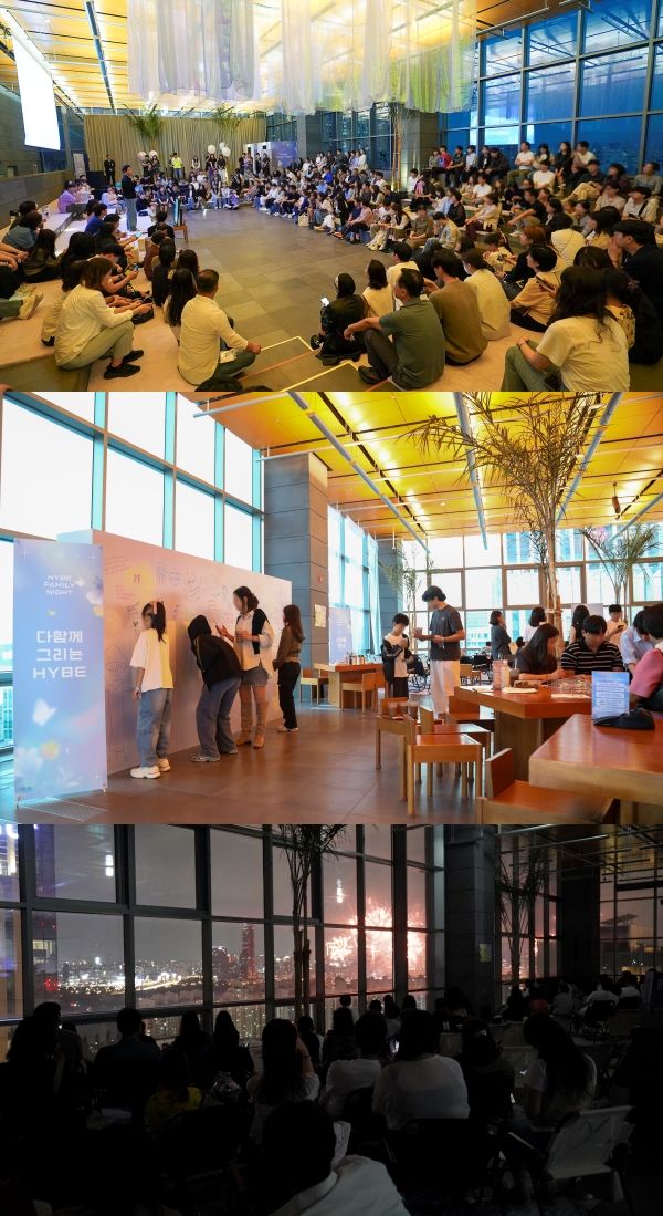 ÇÏÀ̺ê´Â ÆÐ¹Ð¸® ³ªÀÌÆ® Çà»ç¿¡ ¾Õ¼ Áö³ 5¿ù '°¡Á¤ÀÇ ´Þ'À» ¸Â¾Æ ±¸¼º¿ø °¡Á·µéÀ» ÃÊÃ»ÇØ »ç¿Á Åõ¾î¸¦ ÇÏ´Â 'ÇÏÀÌºê ÆÐ¹Ð¸® µ¥ÀÌ(HYBE FAMILY DAY)'µµ ÁøÇàÇÑ ¹Ù ÀÖ´Ù. Çà»ç¿¡ Âü¿©ÇÑ °¡Á·µéÀº »ç¹« °ø°£Àº ¹°·Ð, ±ØÀå¿ë ½ºÇÇÄ¿¿Í ´ëÇü ½ºÅ©¸°À» °®Ãá ½Ã»ç½Ç, ÇÏÀÌºê ¹ÂÁ÷±×·ì ¾ÆÆ¼½ºÆ®°¡ ½ÇÁ¦ ÀÌ¿ëÇÏ´Â ³ìÀ½½Ç, ¾È¹« ¿¬½À½Ç, ÃÔ¿µ ½ºÆ©µð¿À µî »ç¿Á °÷°÷À» µÑ·¯º¸¸ç ȸ»ç¿Í ¾÷¹«¸¦ ÀÌÇØÇÏ°í ±â¾÷ ¹®È¸¦ üÇèÇÏ´Â ½Ã°£À» °¡Á³´Ù.