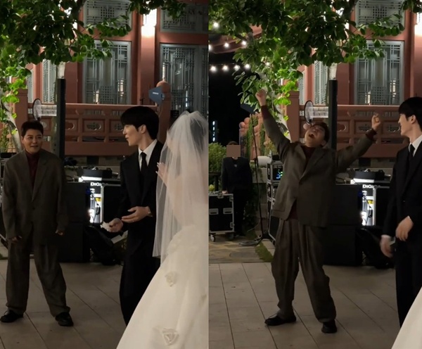 °¡¼ö ÀûÀç¿Í ¾Æ³ª¿î¼ Çã¼Û¿¬ÀÇ °áÈ¥½Ä ÇöÀå¿¡¼ ÃÔ¿µÇÑ ¿µ»óÀ¸·Î, ºÎÅä´Ï¿¡¸¦ ´øÁö´Â ½Å¶û ÀûÀçÀÇ ¸ð½À°ú ºÎÅä´Ï¿¡¸¦ ¹Þ°í Å©°Ô ȯȣÇÏ´Â ÀüÇö¹«ÀÇ ¸ð½ÀÀÌ ´ã°å´Ù.