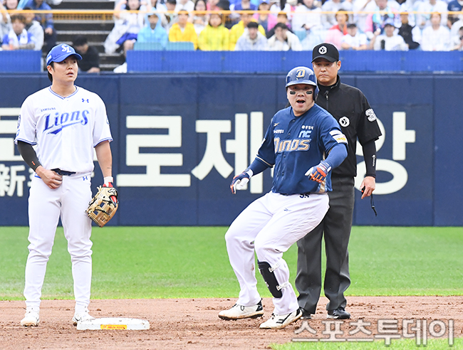 [´ë±¸=½ºÆ÷Ã÷Åõµ¥ÀÌ ÆØÇöÁØ ±âÀÚ] 6ÀÏ ´ë±¸ »ï¼º¶óÀÌ¿ÂÁîÆÄÅ©¿¡¼­ ¿­¸° 2025 KBO¸®±× Æ÷½ºÆ®½ÃÁð NC ´ÙÀ̳뽺¿Í »ï¼º ¶óÀÌ¿ÂÁîÀÇ ¿ÍÀϵåÄ«µå(WC) °áÁ¤Àü 1Â÷Àü, 2ȸÃÊ NC À̿켺ÀÌ 2·çŸ¸¦ ³¯¸®°í ÀÖ´Ù. 2025.10.06.
