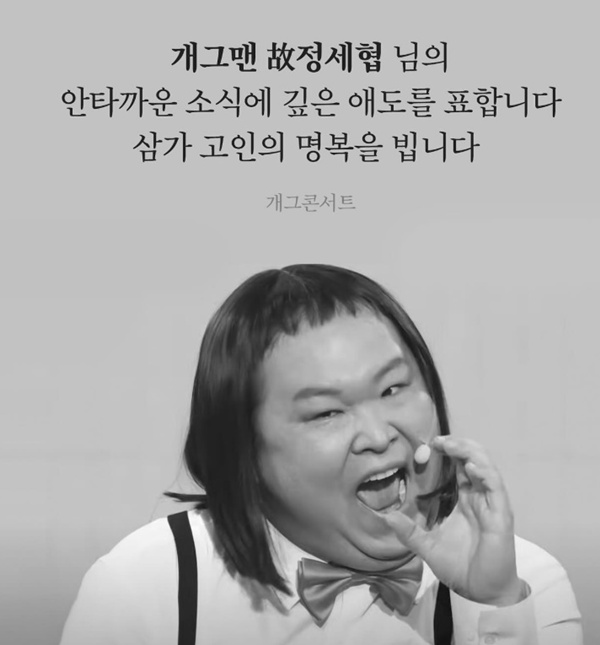 KBS2 '°³±×Äܼ­Æ®'´Â 7ÀÏ °ø½Ä SNS¿¡ "°³±×¸Ç °í(ͺ) Á¤¼¼Çù ´ÔÀÇ ¾ÈŸ±î¿î ¼Ò½Ä¿¡ ±íÀº ¾Öµµ¸¦ Ç¥ÇÕ´Ï´Ù. »ï°¡ °íÀÎÀÇ ¸íº¹À» º÷´Ï´Ù"¶ó¸ç ºÎ°í¸¦ ¾Ë·È´Ù.