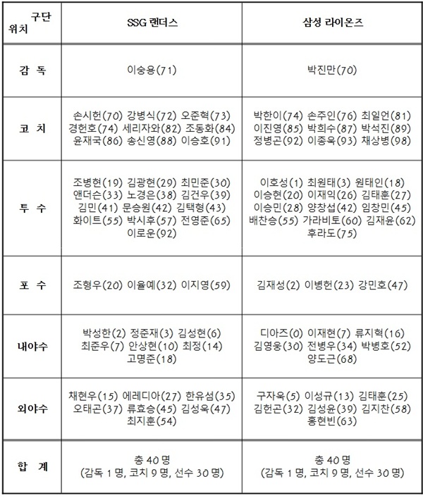Á¤±Ô¸®±× 3À§·Î ÁØÇ÷¹ÀÌ¿ÀÇÁ¿¡ Á÷ÇàÇÑ SSG´Â Åõ¼ö 13¸í°ú Æ÷¼ö 3¸í, ³»¾ß¼ö 7¸í, ¿Ü¾ß¼ö 7¸íÀ¸·Î ¸í´ÜÀ» ±¸¼ºÇß´Ù.