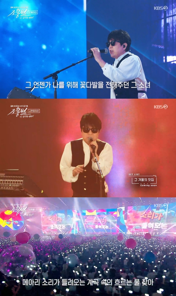 Áö³ 6ÀÏ ¹æ¼ÛµÈ ±¤º¹ 80ÁÖ³â KBS ´ë±âȹ 'Á¶¿ëÇÊ, ÀÌ ¼ø°£À» ¿µ¿øÈ÷'´Â ´ëÇѹα¹ÀÇ ¸ðµç ¼¼´ë¸¦ ¾Æ¿ì¸£´Â ·¹Àüµå, Á¶¿ëÇÊÀÌ KBS¿¡¼ 1997³â 'ºò¼î' ÀÌÈÄ 28³â ¸¸¿¡ ¼±º¸ÀÌ´Â ´Üµ¶ ¹«´ë´Ù. Áö³ 9¿ù ¼¿ï ±¸·Î±¸ °íô½ºÄ«À̵¼¿¡¼ ÁøÇàµÈ ÇØ´ç °ø¿¬Àº Ãß¼® ´çÀÏÀÎ 6ÀÏ KBS2¸¦ ÅëÇØ ¹æ¿µµÆ´Ù.
