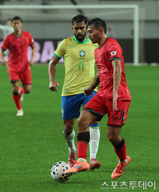 [½ºÆ÷Ã÷Åõµ¥ÀÌ ÆØÇöÁØ ±âÀÚ] 10ÀÏ ¼¿ï¿ùµåÄŰæ±âÀå¿¡¼ ¿¸° Ã౸±¹°¡´ëÇ¥ÆÀ Çѱ¹°ú ºê¶óÁúÀÇ Ä£¼±°æ±â, Çѱ¹ Ä«½ºÆ®·ÎÇÁ°¡ °ø°ÝÇϰí ÀÖ´Ù. 2025.10.10.