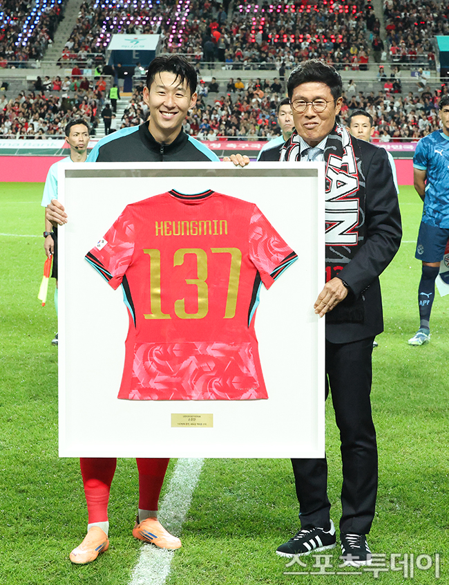 [½ºÆ÷Ã÷Åõµ¥ÀÌ ÆØÇöÁØ ±âÀÚ] 14ÀÏ ¼¿ï¿ùµåÄŰæ±âÀå¿¡¼ ¿¸° Ã౸ ±¹°¡´ëÇ¥ÆÀ Çѱ¹°ú ÆÄ¶ó°úÀÌÀÇ Ä£¼±°æ±â, ĸƾ ¼ÕÈï¹ÎÀÇ 137°æ±â ÃÖ´ÙÃâÀü ±â³ä½ÄÀÌ ¿¸®°í ÀÖ´Ù. »çÁø ¿À¸¥ÂÊÀº Ã౸·¹Àüµå Â÷¹ü±Ù. 2025.10.14.