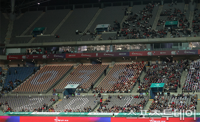 [½ºÆ÷Ã÷Åõµ¥ÀÌ ÆØÇöÁØ ±âÀÚ] 14ÀÏ ¼­¿ï¿ùµåÄŰæ±âÀå¿¡¼­ ¿­¸° Ã౸ ±¹°¡´ëÇ¥ÆÀ Çѱ¹°ú ÆÄ¶ó°úÀÌÀÇ Ä£¼±°æ±â ½ÃÀÛÀ» ¾ÕµÎ°í °æ±âÀåÀÌ ÅÖºó ¸ð½ÀÀ» Çϰí ÀÖ´Ù. »ó¾ÏÀº 2¸¸¸í ³²ÁþÇÑ ÆÒµéÀÌ ÀÚ¸®¸¦ Çß´Ù. 2025.10.14.