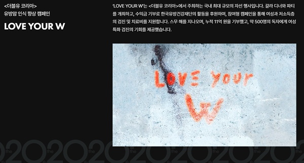 WÄÚ¸®¾Æ´Â ¾à 20³âµ¿¾È À¯¹æ¾Ï ÀÎ½Ä Çâ»ó Ä·ÆäÀÎ '·¯ºê À¯¾î ´õºíÀ¯'¸¦ ÁøÇàÇØ¿Ô´Ù. ÀÚ¼± Çà»ç·Î ÁøÇàµÈ ÇØ´ç Ä·ÆäÀο¡´Â ¼ö¸¹Àº À¯¸í ¿¬¿¹ÀεéÀÌ ÃëÁö¿¡ µ¿ÂüÇÏ¸ç ¶æÀ» ¸ð¾Ò´Ù. ÀÌ¿¡ WÄÚ¸®¾Æ´Â 20³â µ¿¾È ´©Àû ±âºÎ¾× 11¾ï¿ø, À¯¹æ°Ç°­Àç´Ü Ȱµ¿À» ÈÄ¿øÇϰí, ¾à 500¸íÀÇ µ¶ÀÚ¿¡°Ô ¿©¼º Ưȭ °ËÁø ±âȸ¸¦ Á¦°øÇß´Ù°í È«º¸Çß´Ù.