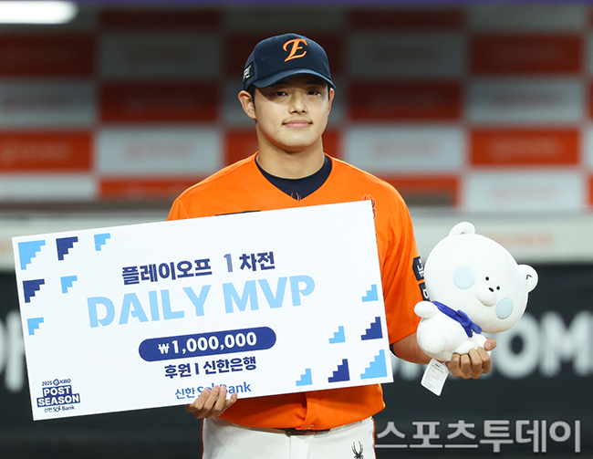 [´ëÀü=½ºÆ÷Ã÷Åõµ¥ÀÌ ÆØÇöÁØ ±âÀÚ] 18ÀÏ ´ëÀüÇÑÈ»ý¸íº¼ÆÄÅ©¿¡¼ ¿¸° 2025 KBO¸®±× Æ÷½ºÆ®½ÃÁð Ç÷¹ÀÌ¿ÀÇÁ »ï¼º ¶óÀÌ¿ÂÁî¿Í ÇÑÈ À̱۽ºÀÇ 1Â÷Àü, 9-8·Î ÇÑȰ¡ ½Â¸®Çß´Ù. ÇÑÈ ¹®µ¿ÁÖ°¡ µ¥Àϸ®MVP¸¦ ¹Þ°í ÀÖ´Ù. 2025.10.18.