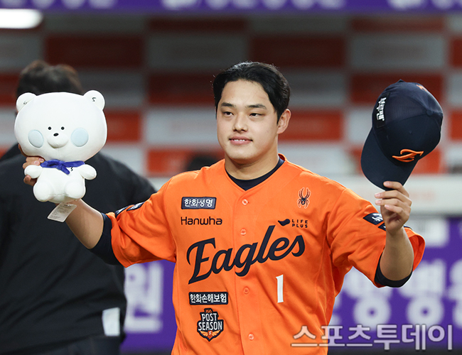 [´ëÀü=½ºÆ÷Ã÷Åõµ¥ÀÌ ÆØÇöÁØ ±âÀÚ] 18ÀÏ ´ëÀüÇÑÈ»ý¸íº¼ÆÄÅ©¿¡¼ ¿¸° 2025 KBO¸®±× Æ÷½ºÆ®½ÃÁð Ç÷¹ÀÌ¿ÀÇÁ »ï¼º ¶óÀÌ¿ÂÁî¿Í ÇÑÈ À̱۽ºÀÇ 1Â÷Àü, 9-8·Î ÇÑȰ¡ ½Â¸®Çß´Ù. ÇÑÈ ¹®µ¿ÁÖ°¡ µ¥Àϸ®MVP¸¦ ¹Þ°í ÀÖ´Ù. 2025.10.18.