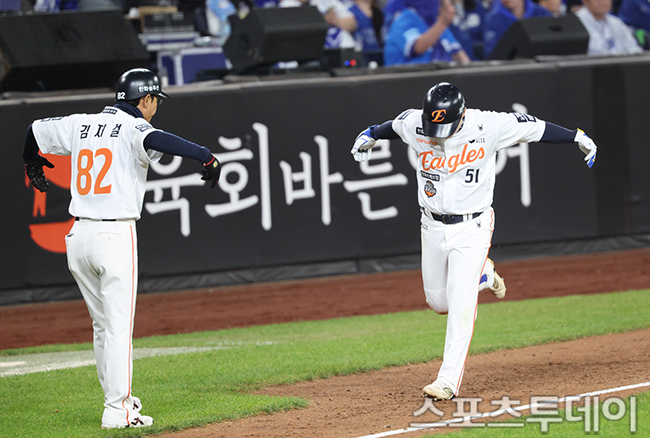 [´ëÀü=½ºÆ÷Ã÷Åõµ¥ÀÌ ÆØÇöÁØ ±âÀÚ] 24ÀÏ ´ëÀüÇÑÈ­»ý¸íº¼ÆÄÅ©¿¡¼­ ¿­¸° 2025 KBO¸®±× Æ÷½ºÆ®½ÃÁð »ï¼º ¶óÀÌ¿ÂÁî¿Í ÇÑÈ­ À̱۽ºÀÇ Ç÷¹ÀÌ¿ÀÇÁ 5Â÷Àü, 8ȸ¸» 1»ç 1·ç ÇÑÈ­ ¹®ÇöºóÀÌ È¨·±À» ³¯¸®°í ÀÖ´Ù. 2025.10.24.