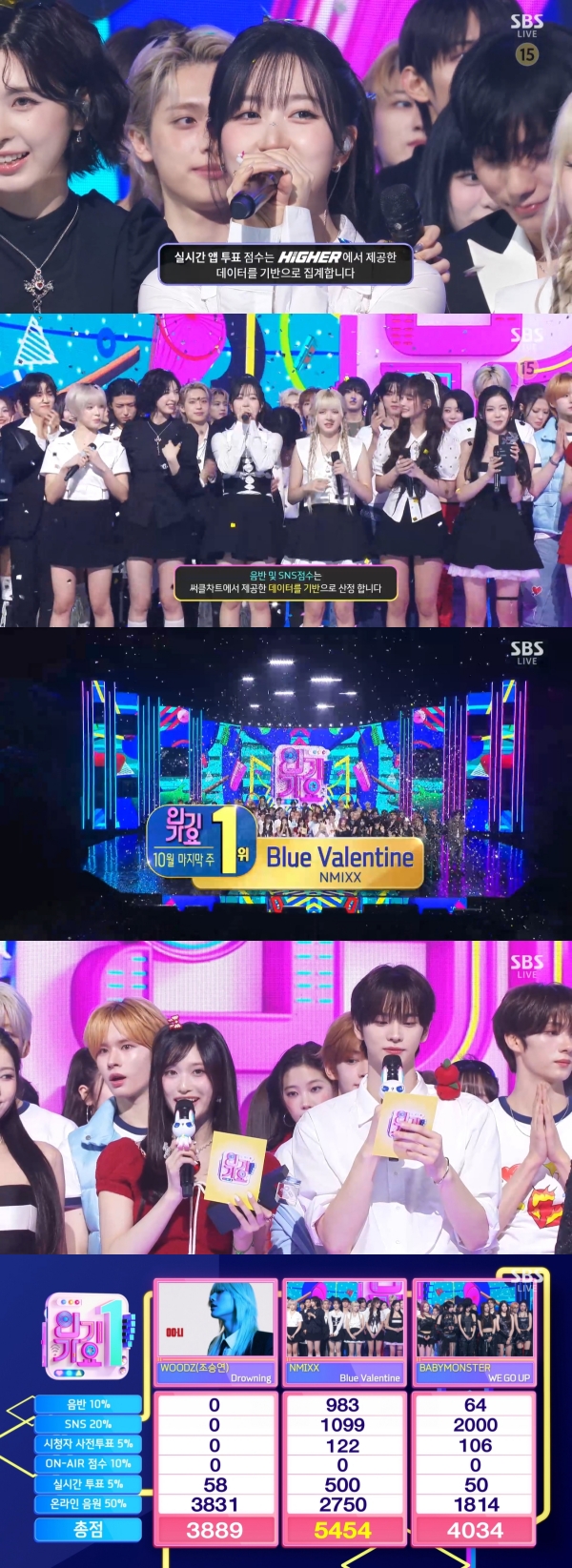 Áý°è °á°ú ¿£¹Í½º 'ºí·ç ¹ß·»Å¸ÀÎ(Blue Valentine)'ÀÌ À½¹Ý 983Á¡, SNS 1099Á¡, ½ÃûÀÚ »çÀüÅõÇ¥ 122Á¡, ½Ç½Ã°£ ÅõÇ¥ 500Á¡, ¿Â¶óÀÎ À½¿ø 2750Á¡ ÃÑ 5454Á¡À¸·Î 1À§¸¦ Â÷ÁöÇß´Ù. 2À§´Â ÃÑ 4034Á¡À» Â÷ÁöÇÑ º£À̺ñ¸ó½ºÅÍ 'À§ °í ¾÷(WE GO UP)', 3À§´Â ÃÑ 3889Á¡ÀÇ ¿ìÁî(WOODZ) 'µå¶ó¿ì´×(Drowning)'À̾ú´Ù.