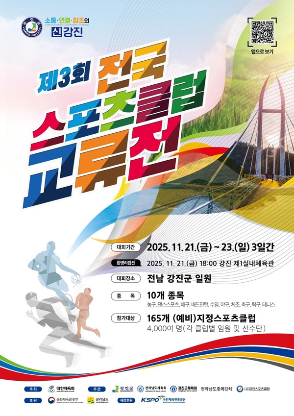 À̹ø ±³·ùÀüÀº (¿¹ºñ)ÁöÁ¤½ºÆ÷Ã÷Ŭ·´ °£ÀÇ ±â·®À» °Ü·ç¸ç Âü°¡ÀÚµéÀÇ ÈÇÕ°ú ¼ÒÅëÀ» ³ª´©´Â ÀÚ¸®·Î, 11¿ù 21ÀÏ ¿ÀÈÄ 6½Ã, °Áø Á¦1½Ç³»Ã¼À°°ü¿¡¼ÀÇ È¯¿µ¸®¼Á¼ÇÀ» ½ÃÀÛÀ¸·Î 11¿ù 22Àϰú 23ÀÏ¿¡ Á¾¸ñº° °æ±â°¡ ÁøÇàµÉ ¿¹Á¤ÀÌ´Ù. ¿ÃÇØ´Â ¿ª´ë ÃÖ´ë ±Ô¸ðÀÎ Àü±¹ 105°³ (¿¹ºñ)ÁöÁ¤½ºÆ÷Ã÷Ŭ·´ 3500¸íÀÇ ¼±¼ö´ÜÀÌ °ÁøÁ¾ÇտÀå µî 18°³ °æ±âÀå¿¡¼ ÃÑ 10°³ Á¾¸ñ(³ó±¸, ´í½º½ºÆ÷Ã÷, ¹è±¸, ¹èµå¹ÎÅÏ, ¼ö¿µ, ¾ß±¸, üÁ¶, Ã౸, ʱ¸, Å״Ͻº)¿¡ Âü°¡ÇÏ¿© ¿ÀüÀ» ÆîÄ£´Ù.
