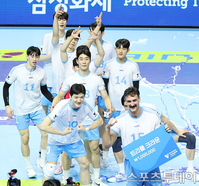 ´ëÇÑÇ×°øÀÌ KB¼ÕÇØº¸ÇèÀ» »ó´ë·Î ¼¼Æ®½ºÄÚ¾î 3-0 ½Â¸®¸¦ Çϰí ÀÖ´Ù. 2025.11.25.