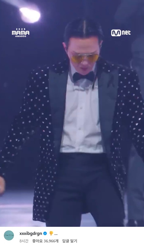 Áöµå·¡°ïÀº Áö³­ 29ÀÏ '2025 ¸¶¸¶ ¾î¿öÁî(2025 MAMA AWARDS)' °ø½Ä °èÁ¤¿¡ ¿Ã¶ó¿Â ÀÚ½ÅÀÇ ¹«´ë ¿µ»ó ´ñ±Û¿¡ ¾öÁö¸¦ ¾Æ·¡·Î ³»¸° 'ºÕµû' À̸ðƼÄÜÀ» ³²°å´Ù.