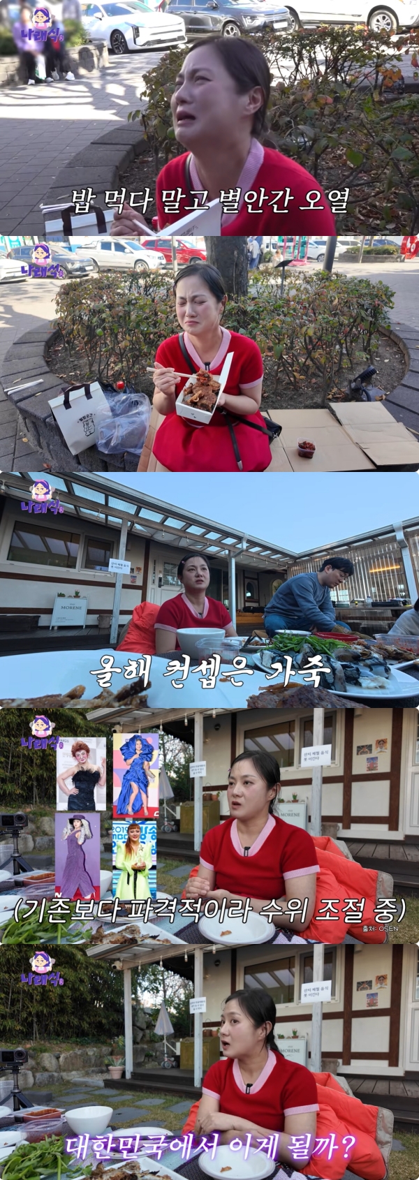 ÀÌ¾î ¿ÃÇØ ¿¬¸» ½Ã»ó½Ä¿¡¼­ ÀÔÀ» µå·¹½º¸¦ ½ºÆ÷Çß´Ù. ¹Ú³ª·¡´Â "¿ÃÇØ ÄܼÁÆ®´Â °¡Á×"À̶ó¸ç "Áö±Ý ¼öÀ§ Á¶Àý ÁßÀÌ´Ù. ´ëÇѹα¹¿¡¼­ ÀÌ°Ô µÉ±î?"¶ó°í ±Í¶êÇØ ´«±æÀ» ²ø¾ú´Ù. ÀÌ¿¡ Á¦ÀÛÁøÀÌ "¼³¸¶ äÂï µé¾î¿ä?"¶ó¸ç ³î¶ó ¿ôÀ½À» ¾È°å´Ù.