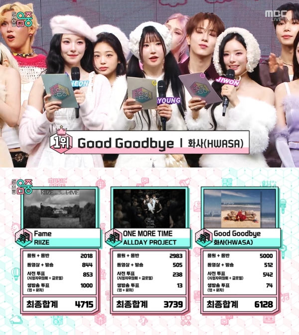 Áý°è °á°ú È­»çÀÇ '±Â ±Â¹ÙÀÌ(Good Goodbye)'°¡ À½¿ø+À½¹Ý 5000Á¡, µ¿¿µ»ó+¹æ¼Û 512Á¡, »çÀüÅõÇ¥ 542Á¡, »ý¹æ¼Û ÅõÇ¥ 74Á¡ ÃÑ 6128Á¡À¸·Î 1À§¿¡ ¿Ã¶ú´Ù. ¶óÀÌÁîÀÇ 'ÆäÀÓ(Fame)'Àº 4715Á¡À¸·Î 2À§, ¿Ãµ¥ÀÌ ÇÁ·ÎÁ§Æ® '¿ø ¸ð¾î ŸÀÓ(ONE MORE TIME)'Àº 3739Á¡À¸·Î 3À§¸¦ Â÷ÁöÇß´Ù.