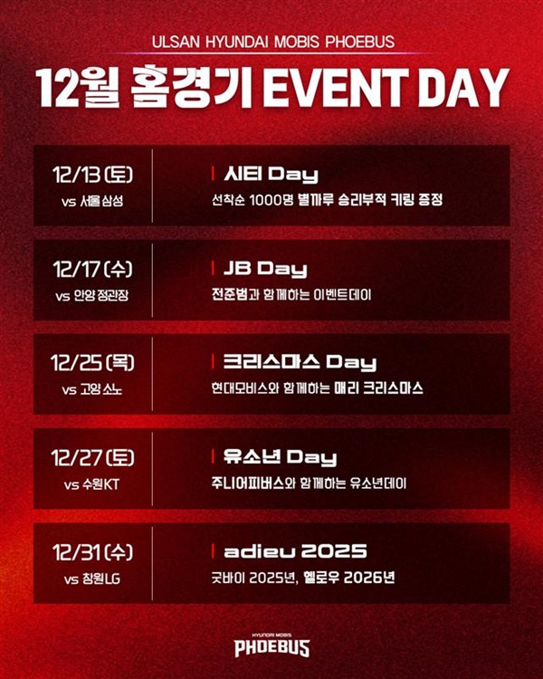 À̿ܿ¡µµ 27ÀÏ ¼ö¿ø KT¿ÍÀÇ È¨°æ±â¿¡¼´Â °Ü¿ï ¹æÇÐÀ» ¸ÂÀº ÁִϾîÇǹöÃ÷¸¦ À§ÇÑ 'À¯¼Ò³â DAY'°¡ ¸¶·ÃµÇ¸ç, 31ÀÏ Ã¢¿ø LG¿ÍÀÇ 2025³â ¸¶Áö¸· Ȩ°æ±â¿¡¼´Â ÇÑ ÇØ¸¦ µÇµ¹¾Æº¸¸ç »õ·Î¿î 2026³âÀ» ¸ÂÀÌÇÏ´Â 'adieu(¾Æµà) 2025'°¡ ÁøÇàµÉ ¿¹Á¤ÀÌ´Ù.