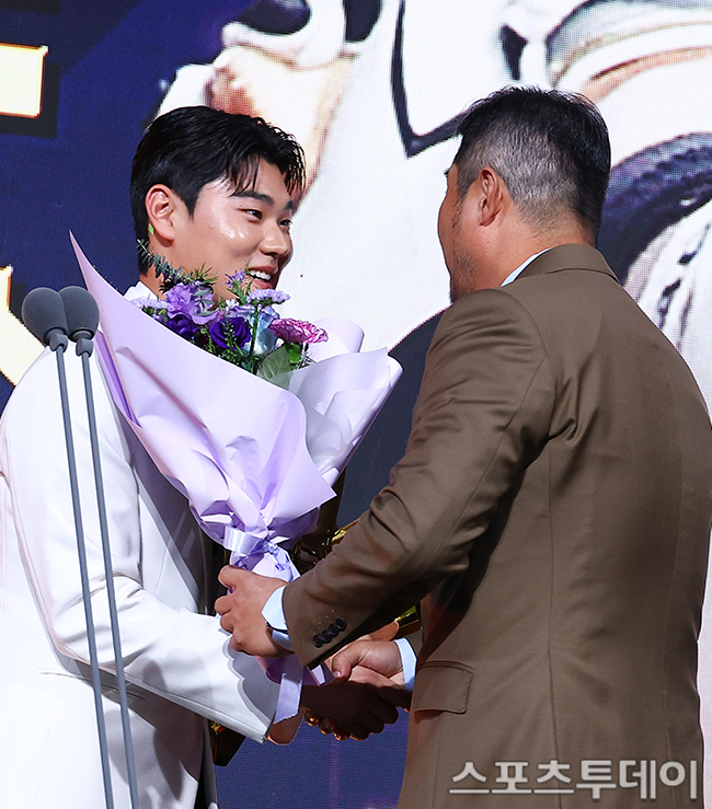 [½ºÆ÷Ã÷Åõµ¥ÀÌ ÆØÇöÁØ ±âÀÚ] NC ±èÁÖ¿øÀÌ 9ÀÏ ¼¿ï Àá½Ç ·Ôµ¥È£ÅÚ¿ùµå¿¡¼ ¿¸° 2025 KBO °ñµç±Û·¯ºê ½Ã»ó½Ä¿¡¼ À¯°Ý¼ö ºÎ¹®À» ¼ö»ó ÈÄ ÀÌÈ£ÁØ °¨µ¶ÀÇ ÃàÇϸ¦ ¹Þ°í ÀÖ´Ù. 2025.12.09.