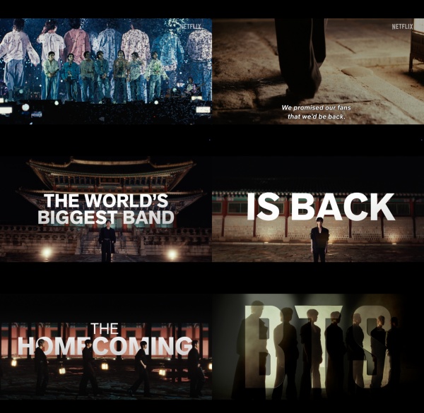À̾î RMÀÇ "We promised our fans that we'd be back"À̶ó´Â ³»·¹À̼ǰú ÇÔ²² °æº¹±ÃÀ¸·Î Àå¸éÀÌ ÀüȯµÈ´Ù. ¸â¹öµéÀº ³·°ú ¹ãÀÌ ±³Â÷ÇÏ´Â °æº¹±ÃÀ» ¹è°æÀ¸·Î °·ÄÇÑ Á¸Àç°¨À» µå·¯³½´Ù. ¶ÇÇÑ "THE WORLD'S BIGGEST BAND IS BACK"(¼¼°è ÃÖÁ¤»óÀÇ ±×·ìÀÌ µ¹¾Æ¿Â´Ù), "WITNESS THE HOMECOMING"(±×µéÀÇ ±ÍȯÀ» ¸ñµµÇ϶ó)À̶ó´Â ¹®±¸°¡ µîÀåÇØ ÄĹ鿡 ´ëÇÑ ±â´ë°¨À» ÃÖ°íÁ¶·Î ²ø¾î¿Ã¸°´Ù. ¸â¹öµéÀº "ÇϳªÇϳª ¹º°¡°¡ ´Þ¶óÁø´Ù´Â ´À³¦À» ¸¹ÀÌ ¹Þ¾Ò¾î¿ä" "ÀúÈñ 7¸íÀÌ ÇÔ²² ÀÌ ±æÀ» °è¼Ó °É¾î°¥ ¼ö ÀÖ°í °è¼Ó Çì¾öÃijª°¥ ¼ö ÀÖ´Ù°í »ý°¢ÇÕ´Ï´Ù"¶ó°í ¸»ÇÏ¸ç »õ·Î¿î ¿©Á¤À» ÇâÇÑ °ÇÑ ÀÇÁö¿Í ±â´ë¸¦ µå·¯³Â´Ù. ¿µ»ó°ú ÇÔ²² °ø°³µÈ Æ÷½ºÅÍ¿¡´Â ±¤È¹® ¾Õ¿¡ ¼± Àϰö ¸â¹öÀÇ ½Ç·ç¿§ÀÌ ´ã°Ü ´«±æÀ» ²ø¾ú´Ù.