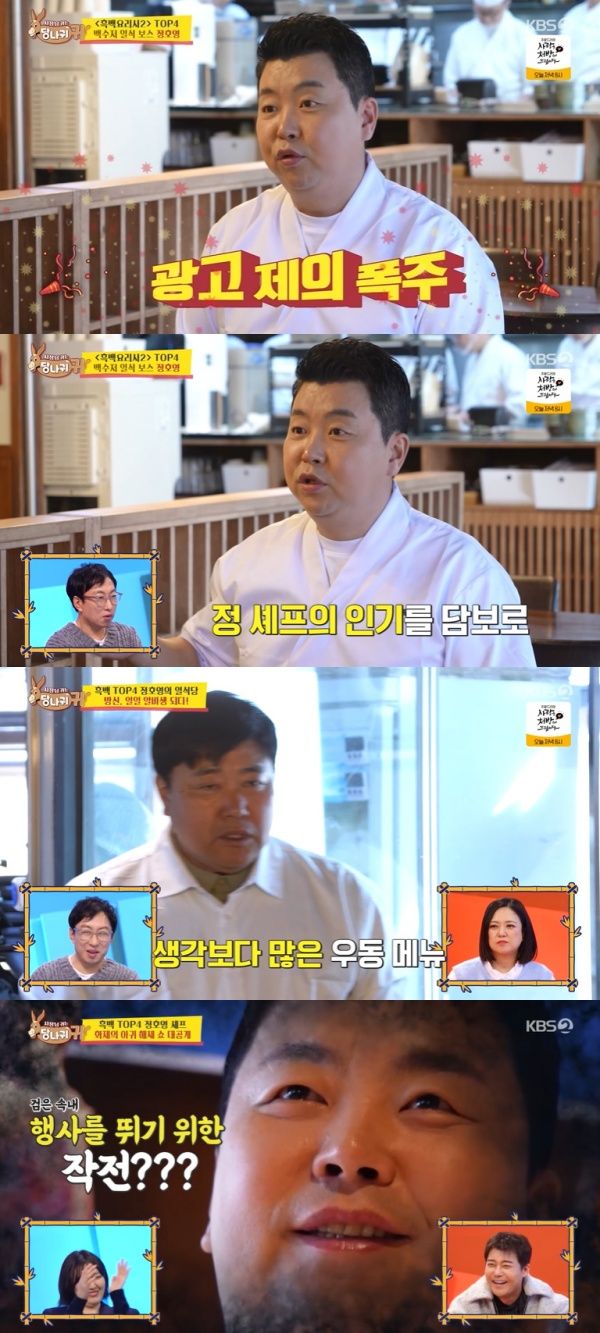 ¸¶Áö¸·À¸·Î ÀÏ½Ä ¼ÎÇÁ Á¤È£¿µÀÌ µîÀåÇß´Ù. Á¤È£¿µÀº ÀÚ½ÅÀÇ ½Ä´ç¿¡ '¹æ½Å' ¾çÁØÇõÀ» ÃÊ´ëÇØ ÇÔ²² ¿ìµ¿À» ¸Ô¾ú´Ù. ±×´Â 'Èæ¹é¿ä¸®»ç: ¿ä¸® °è±Þ ÀüÀï2' ÀÌÈÄ Ä¡¼ÚÀº Àα⿡ "ÇöÀç ³íÀÇ ÁßÀÎ ±¤°í°¡ 5°³ Á¤µµ ÀÖ´Ù. ÀüÀÚÁ¦Ç°, ½Äǰ, ÁÖ¹æ¿ëǰ µîÀÌ ÀÖ´Ù"°í ¹àÇû´Ù.