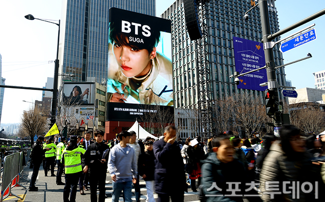 [½ºÆ÷Ã÷Åõµ¥ÀÌ ÆØÇöÁØ ±âÀÚ] ±º¹é±â¸¦ ¸¶Ä¡°í 3³â 9°³¿ù ¸¸¿¡ ¿ÏÀüü·Î µ¹¾Æ¿Â ¹æÅº¼Ò³â´Ü(BTS)ÀÇ 5Áý '¾Æ¸®¶û'(ARIRANG) ÄÄ¹é °ø¿¬ÀÌ 21ÀÏ Àú³á 8½Ã ¼­¿ï ±¤È­¹®¿¡¼­ ¿¹Á¤µÈ °¡¿îµ¥ À̸¥ ½Ã°£ºÎÅÍ ¸ðÀÎ BTS ÆÒµé·Î ±¤È­¹® ÀÏ´ë°¡ ºÏÀûÀ̰í ÀÖ´Ù. 2026.03.21.