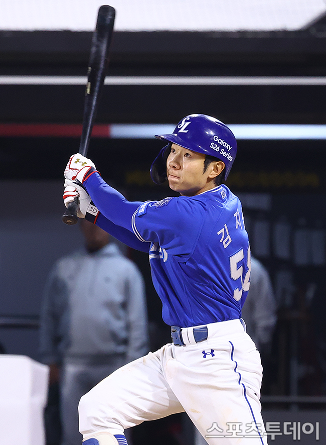 [¼ö¿ø=½ºÆ÷Ã÷Åõµ¥ÀÌ ÆØÇöÁØ ±âÀÚ] 3ÀÏ ¼ö¿øKTÀ§ÁîÆÄÅ©¿¡¼ ¿¸° 2026 KBO¸®±× »ï¼º ¶óÀÌ¿ÂÁî¿Í KT À§ÁîÀÇ °æ±â, 5ȸÃÊ 1»ç 1·ç »ï¼º ±èÁöÂùÀÌ ÁÂÀͼö ÇöóÀ̺¼À» ³¯¸®°í ÀÖ´Ù. 2026.04.03.
