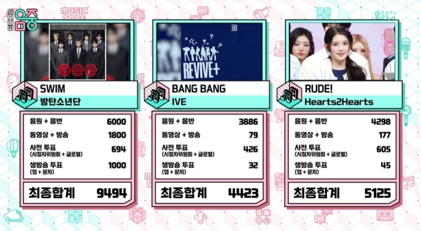 ¾ÆÀ̺êÀÇ 'BANGBANG'(¹ð¹ð)Àº ÃÑÁ¡ 4423Á¡À» ¹Þ¾Æ 3À§, ÇÏÃ÷ÅõÇÏÃ÷ÀÇ 'RUDE!'(·çµå!)´Â ÃÑÁ¡ 5125Á¡À¸·Î 2À§¿¡ ·©Å©µÆ´Ù.