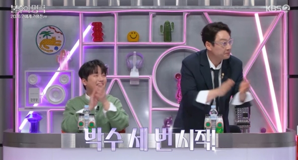 ±×·¯ÀÚ ±èÁØÇöÀº Á¶¿ëÈ÷ ÀÚ¸®¿¡¼ ÀϾ ÀÌÈÖÀç¿¡°Ô ´Ù°¡°¡´õ´Ï "¾ÆÀú¾¾, Àú±â ¾É¾Æ¼ ¾î¶»°Ô Á» ÇØÁà¿ä"¶ó¸ç ÇØ°áÀ» ¿äûÇß´Ù. ÀÌÂù¿ø ¿· MC¼®¿¡ ¾ÉÀº ÀÌÈÖÀç´Â ¾î¸®µÕÀýÇÑ Ç¥Á¤À» ÁöÀ¸¸é¼µµ À̳» "¹Ú¼ö ¼¼ ¹ø ½ÃÀÛ!"À̶ó°í ¿ÜÃÄ ÇöÀåÀ» Á¤¸®Çß´Ù.