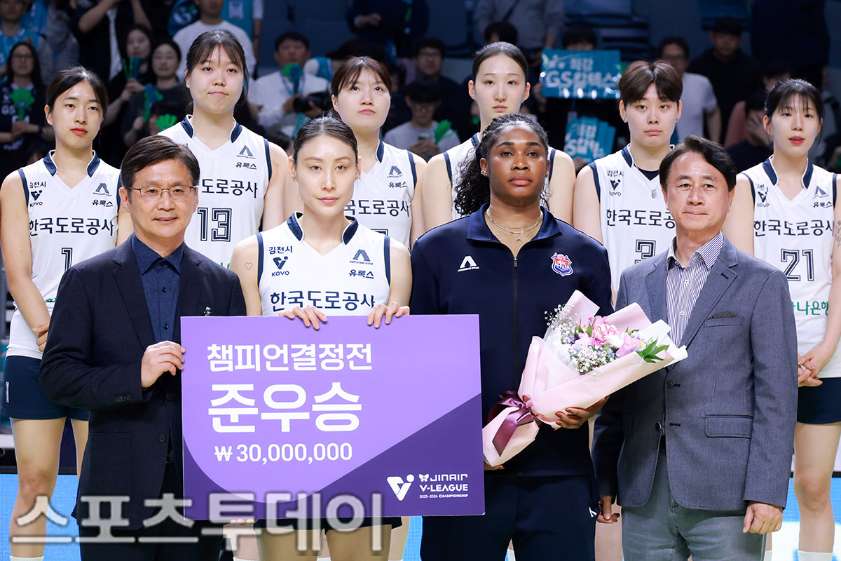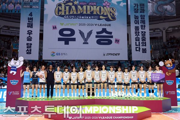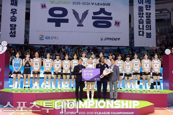 À̳¯ GSĮŨ½º°¡ ¼¼Æ®½ºÄÚ¾î 3-1(25-15 19-25 25-20 25-20)·Î èÇǾð °áÁ¤Àü ¿ì½ÂÀ» Â÷ÁöÇß´Ù. ÁØ¿ì½ÂÀ» Â÷ÁöÇÑ Çѱ¹µµ·Î°ø»ç ¼±¼öµéÀÌ ±â³ä»çÁøÀ» ÃÔ¿µÇϰí ÀÖ´Ù.2026.04.05.