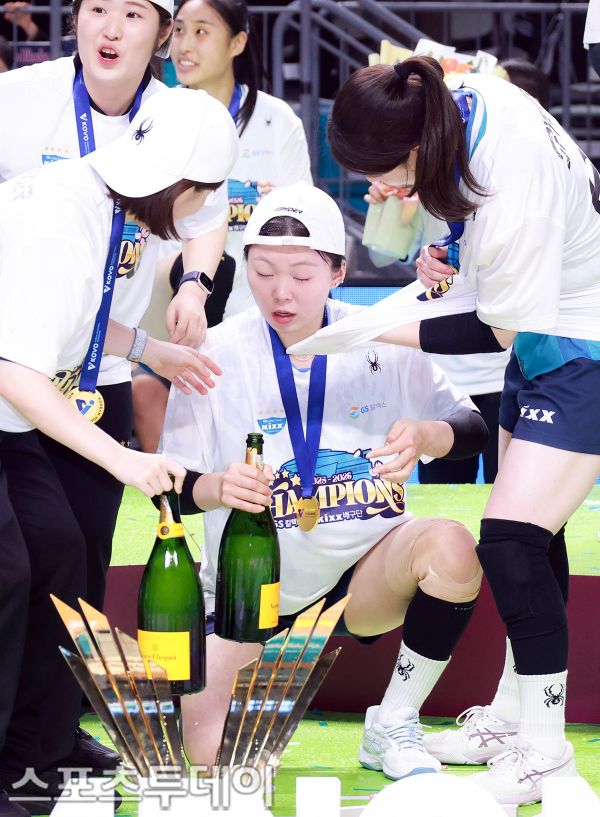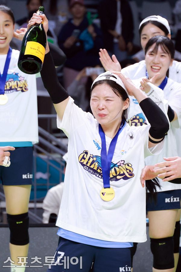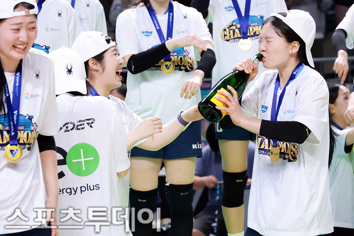 À̳¯ GSĮŨ½º°¡ ¼¼Æ®½ºÄÚ¾î 3-1(25-15 19-25 25-20 25-20)·Î èÇǾð °áÁ¤Àü ¿ì½ÂÀ» Â÷ÁöÇß´Ù. ÇѼöÁø ¼±¼ö°¡ ¼¤ÆäÀÎ ¼¼¸®¸Ó´Ï¸¦ ÇϰíÀÖ´Ù. 2026.04.05.