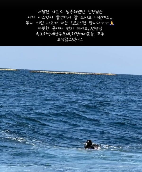 ¾Õ¼ Áö³ 8ÀÏ ¼ÓÃÊÇØ¾ç°æÂû¼¿¡ µû¸£¸é ¼ÓÃʽà ´ëÆ÷Ç× ¾Õ¹Ù´Ù¿¡¼ ¾î¼± Àüº¹ »ç°í·Î ½ÇÁ¾µÈ 70´ë ¼±Àå A¾¾°¡ ¼ö»ö ÀÌÆ² ¸¸¿¡ ¼ûÁø ä ¹ß°ßµÆ´Ù. ¹Î°£Àá¼ö»ç°¡ A¾¾¸¦ ¹ß°ßÇÑ °ÍÀ¸·Î ÀüÇØÁ³´Ù.